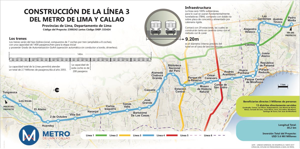 Se estima que 1 millón y medio de personas harán uso a diario de la Línea 3 del Metro de Lima e irá desde el cruce de la avenida Trapiche con Chimpu Ocllo, en Carabayllo, hasta el puente Atocongo, en San Juan de Miraflores.